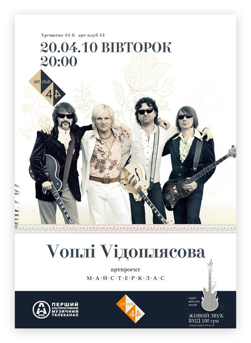 20 апреля в столичном клубе «44» состоится чествование легендарных рокеров «Vоплі Vідоплясова» в рамках арт-проекта «Мастер-Класс». Группа Олега Скрипки представит специальную программу для самых верных поклонников. Во время непопсовых творческого вечера «V.V.» будут отмечены именным дипломом «Стены Славы» украинского рок-н-ролла.