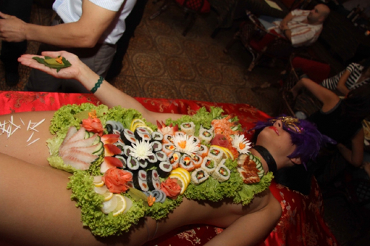 Новинка, которая становится все популярней среди киевлян, не для брезгливых, а для тех, кто любит горяченькое. Ведь оголенные красотки, предлагающие поужинать в одном из столичных ресторанов, не приносят блюда, а сами выступают в качестве посуды. То есть посетителям предлагают отведать суши, разложенные на теле девушки-красавицы.
