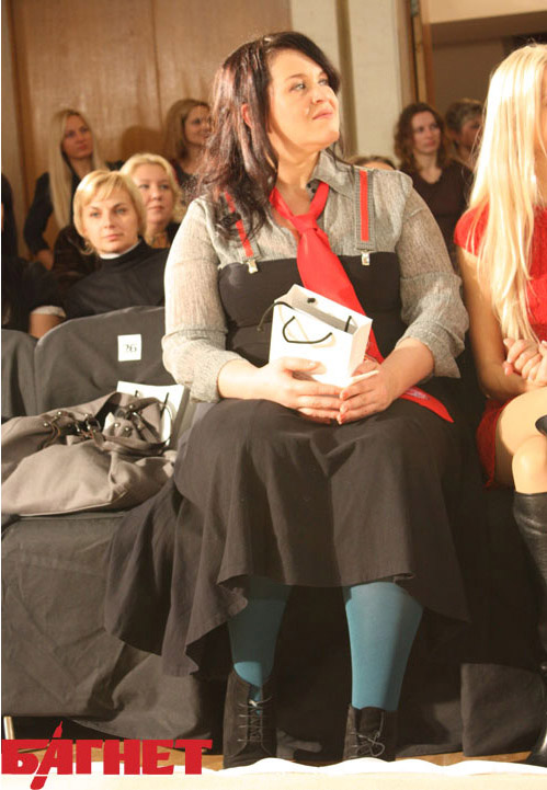 Стройными рядами вокруг импровизированного подиума расселись: Влада Прокаева, Алексей Дивеев–Церковный и Руслана Писанка, которая как для показа мод оделась, по меньшей мере, странно. Даже я, человек о моде знающий разве что как это слово пишется, посчитала ее наряд уж больно фриковым: серая кофта, черная юбка и корсет на красных подтяжках, красный галстук и, в дополнение ко всему, бирюзовые колготки. «Под цвет глаз, наверное» - размышляла я и, в принципе, где-то оказалась права.