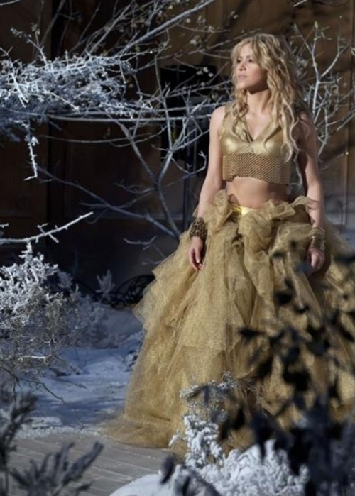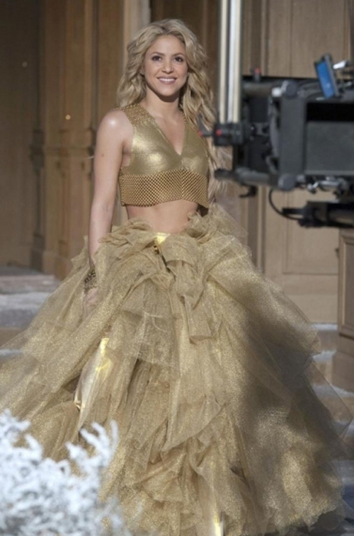 На съемки в Барселоне исполнительница гимна чемпионата мира по футболу 2010 прибыла в роскошном позолоченном платье с глубоким декольте.