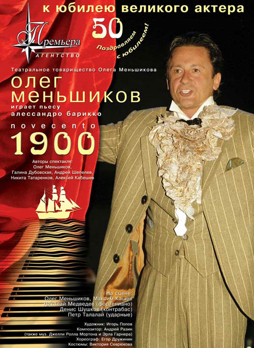 В честь своего 50-летнего юбилея актер Олег Меньшиков сделает подарок всем своим киевским поклонникам. 17 и 18 декабря на сцене Национальной оперы покажут спектакль «1900» Театрального товарищества Олега Меньшикова по пьесе Алессандро Барикко. Авторы спектакля: Олег Меньшиков, Галина Дубовская, Андрей Шепелев, Никита Татаренков, Алексей Кабешев. На сцене: Олег Меньшиков, Максим Кашев, Николай Медведев (фортепиано), Денис Шушков (контрабас), Петр Талалай (ударные).