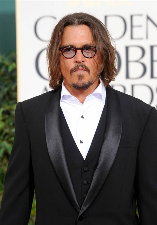 Джонни Депп, номинированный как «лучший актер» за фильмы «Алиса в стране чудес» и «Турист», явился в черном смокинге от «Ralph Lauren Black Label».