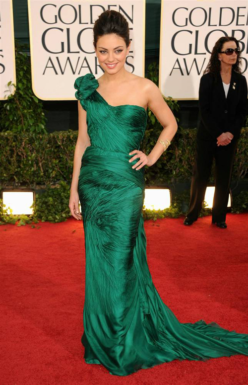 Актриса Мила Кунис, номинированная за роль в фильме «Черный лебедь», в изумрудном платье с открытым плечом от Веры Вонг.