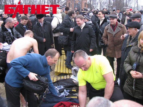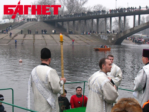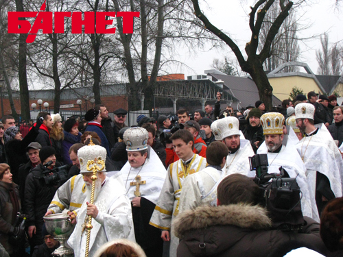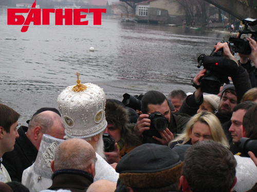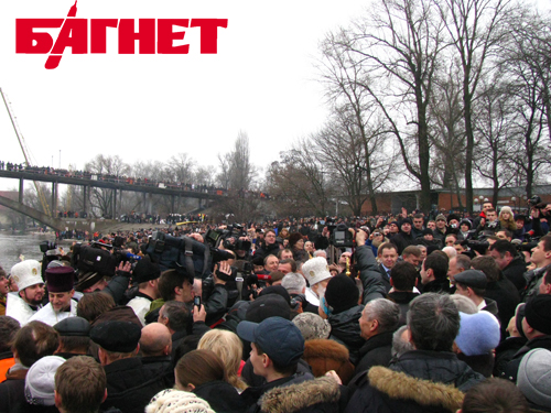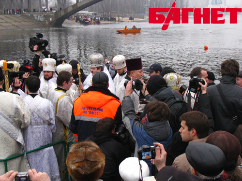 Зрители стали забираться на скамейки, где складывали свои вещи крещенские купальщики. Множество корреспондентов с камерами и микрофонами пытались занять выгодные позиции, а некоторые даже умудрились забраться на мостик, с которого обряд освящения должен был совершиться. В результате на упомянутом возвышении помимо Филарета и его свиты собрались еще и журналисты с охраной.
