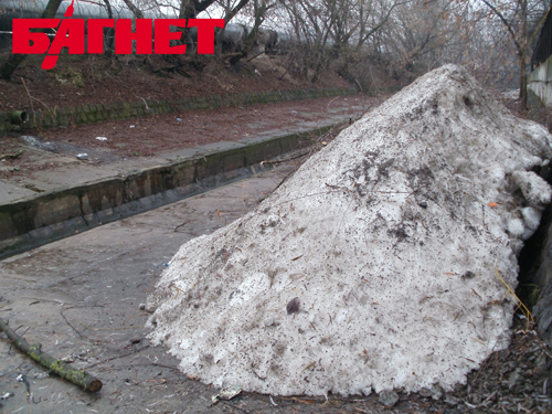 «Багнет» обнаружил недалеко от центра Киева множество стихийных снежных «свалок». Самая большая из них расположена в 0,75 км от ст. метро «Вокзальная» рядом с устьем реки Лыбидь на ул. Короленковской. Остальные ледяные кучи расположены в районе промышленных предприятий на улицах Гайдара и Эренбурга, а также возле моста на ул. Федорова.
