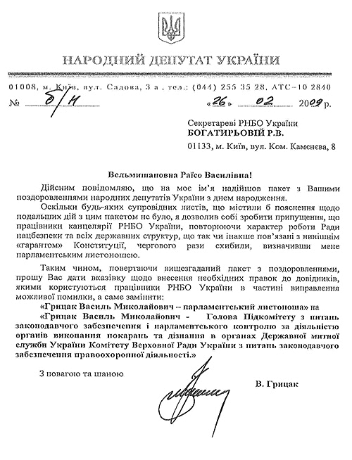 Поскольку его там не оказалось, народный депутат предположил, что подчиненные Богатыревой в очередной раз запутались в «трех соснах». В ответном письме Грицак уведомил Раису Васильевну, что она, очевидно, перепутала его с парламентским почтальоном, и попросил исправить ошибку (см. фото документа).