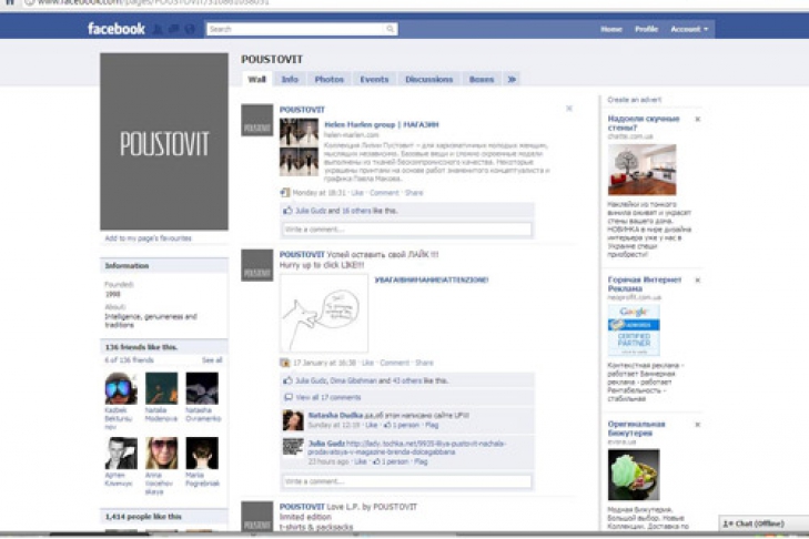 А что же в это время делали украинские дизайнеры? Пик фейсбук-активности украинских марок пришелся на весну прошлого года. Сейчас же ситуация такова, что страничка бренда в Facebook появляется даже раньше, чем дизайнер устроит первый показ или презентацию. Зато когда до этого доходит дело, то без широкого резонанса не обходится – все интересующиеся модой, поставили like. Незадолго до начала Недели моды, дизайнеры активизируются: объявляют кастинги, предлагают пригласительные, разыскивают волонтеров. И можно с уверенностью сказать, что это в настоящий момент одна из составляющих успеха.