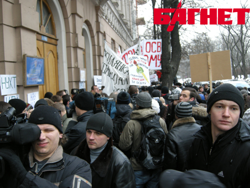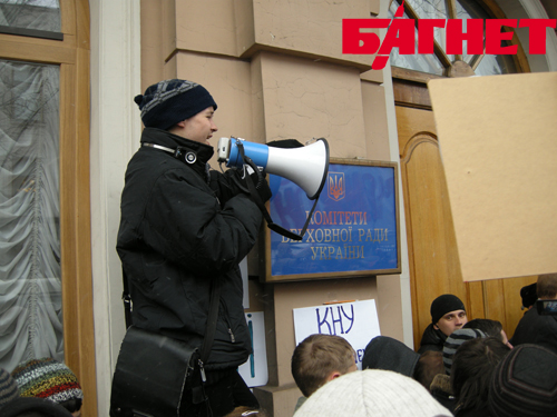 Сегодня киевские студенты провели акцию протеста под стенами здания Комитетов Верховной Рады Украины. Молодые люди протестовали против нового закона «О высшем образовании», над проектом которого работали в частности лидер фракции Партии регионов Александр Ефремов и член этой же фракции Максим Луцкий. Также студенты требовали не допустить сокращения госзаказа в ВУЗах на 40%.