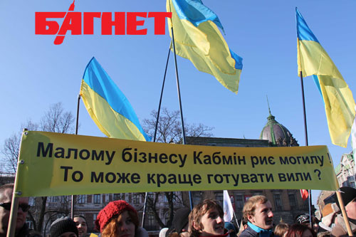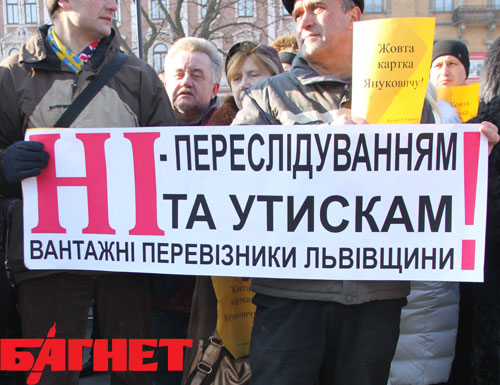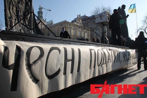 Во Львове сегодня, 1 февраля, состоялась акция протеста предпринимателей против давления на организаторов «налогового Майдана» в конце прошлого года. Собравшиеся вышли на пр. Свободы в центре города с государственными флагами и плакатами «Мы - за честные налоги!», «Азарова в отставку» и «Малому бизнесу Кабмин роет могилу, может тогда лучше готовить вилы». Также митингующие держали листочки формата А-4 желтого цвета с надписью «Желтая карточка Януковичу».