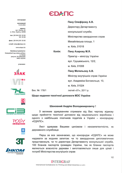 Кроме того, Министерство иностранных дел ранее заявляло, что якобы в связи с финансовыми проблемами не готово к введению системы централизованного оформления консульскими учреждениями Украины заграничных паспортов нового образца. Еще в апреле 2010 года консорциум «ЕДАПС» обратился к главе внешнеполитического ведомства с предложением оказать МИДу техническую помощь на сумму 8 000 000 гривен для установки необходимого оборудования и коммуникаций для полного завершения всех работ и обеспечения централизованного порядка паспортизации граждан Украины за рубежом. Перед этим, в 2008 году консорциумом «ЕДАПС» совместно с Министерством внутренних дел Украины провел работы по установке необходимого оборудования, адаптации программного обеспечения Государственной информационной системы (ГИС) и тестового подключения регионального центра МИД Украины к Главному вычислительному центру Государственной информационной системы МВД Украины. Это позволило начать работы по развертыванию системы для оформления машиносчитываемых загранпаспортов службами МИД Украины, как в Киеве, так и в заграничных дипломатических учреждениях.