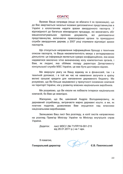 Оказывается, департамент консульской службы МИД «принял к сведению» готовность консорциума ЕДАПС оказать техническую помощь! Скажите, ну не бред: тут предлагают помощь для решения насущной государственной проблемы, а он в ответ – «мы в, который раз, берем во внимание ваше предложение».