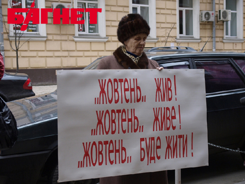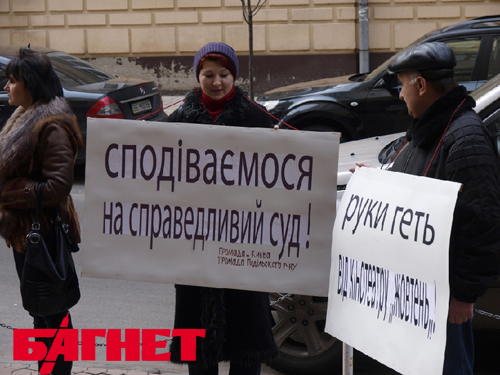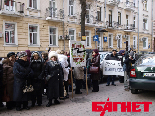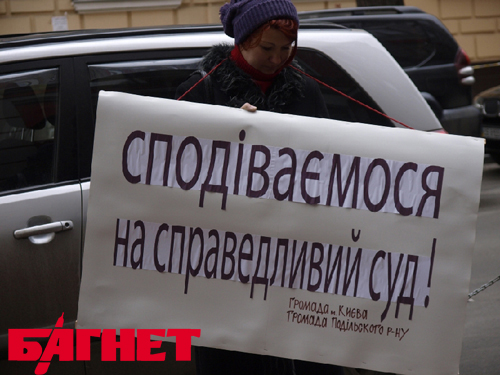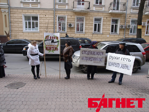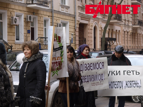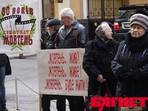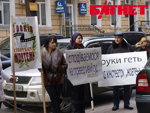 В понедельник, 7 февраля, под стенами Киевского апелляционного суда прошел пикет трудового коллектива кинотеатра «Жовтень» против их выселения.