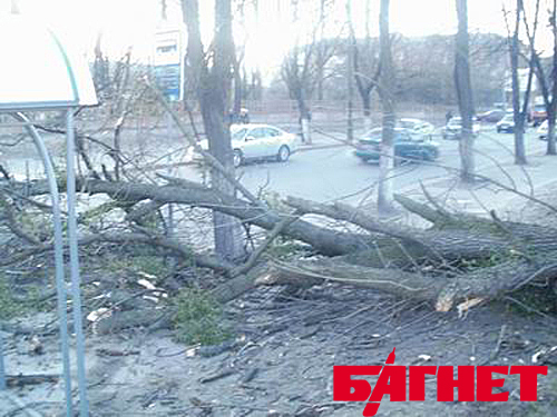 В ночь со вторника на среду из-за сильных порывов ветра, порой достигающих 15-20 м/с, в Киеве повалилось до сотни деревьев в разных частях города.