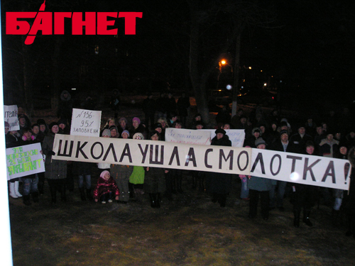 Встреча была назначена на 8 февраля в актовом зале школы. К приходу чиновников около 200 родителей и учеников у главного входа организовали митинг, в ходе которого потребовали от руководства района немедленно возобновить набор в первые и десятые классы на 2011/2012 учебный год.