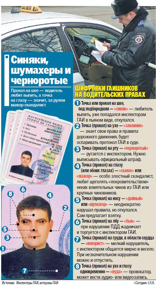 «Тайные пометки на правах и талонах предупреждений в ГАИ ставили еще со времен СССР, актуальны они и сейчас. Опытный инспектор, знающий «тайный язык» точек, без долгого общения с нарушителем ПДД заранее знал, чего от него можно ожидать. «Шифр» прост — пометка на лбу всегда обозначала, что водитель будет «бодаться» — жадничать, но деньги на лапу все равно даст, — откровенничает ветеран ГАИ Игорь Большаков, — а пометка или проколотые тоненькой иголочкой глаза означают «сынка» или «мажора» — такие любят скандалить и звонить всяким высоким покровителям. У «сынков» в основном взяток не берут, а сразу пишут протокол». Свои тайные значения имеют пометки на разных частях водительской фотографии. Как правило, тайные знаки появляются на правах после недолгого общения с инспектором на дороге. «Большинство «ксив» «наши» не помечают за ненадобностью — нормальные люди сами знают свою вину и не доводят дело до протокола, давая «воздух» (взятку. — Авт.), — признался сотрудник одесского ГАИ Алексей, — а пометки на правах ставят тем, кто не хочет «решать вопрос» на месте. Я помечаю права за секунду-другую, если нарушитель начинает скандалить.