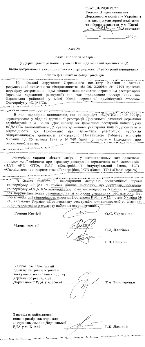 В результате Комитету пришлось прийти к выводу, что Консорциум «ЕДАПС» создан законно. «Комісія дійшла висновку, що держвна реєстрація консорціуму «ЄДАПС» відповідає чинному законодавству України…», - говорится в соответствующем акте Госкомпредпринимательства.