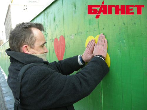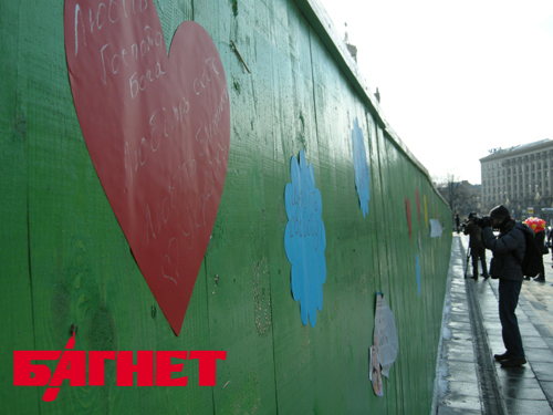 Вчера в честь Дня святого Валентина инициативная группа общественных деятелей, в частности, организации «Стоп цензуре» и профсоюз «Медиафронт», расклеили сердечками и цветочками зеленый забор, который установлен на Майдане Незалежности. Организаторы акции хотели показать, что любые разногласия, которые существуют в социуме, можно преодолеть с помощью любви.
