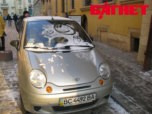В выходные и праздничные дни на улицах Львова появляется много туристов. Есть среди них и весельчаки, которые ради забавы могут нарисовать что-нибудь на припаркованном на тихой улочке авто. Правда, в основном для художеств используют выпавший накануне снег. Таким образом, авто превращается в объект для снежного граффити.