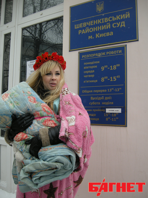 И вот в назначенное время в 10:00 утра 21 февраля Александра Шевченко и Евгения Крайзман, которые ранее «прогуляли» заседание суда, в полном «обмундировании» прибыли в Шевченковский районный суд. Девушки запаслись теплыми одеялами, бельем, полотенцами, сапогами, консервами, туалетной бумагой и сигаретами, ожидая, что могут быть отправлены из зала суда в тюремную камеру.