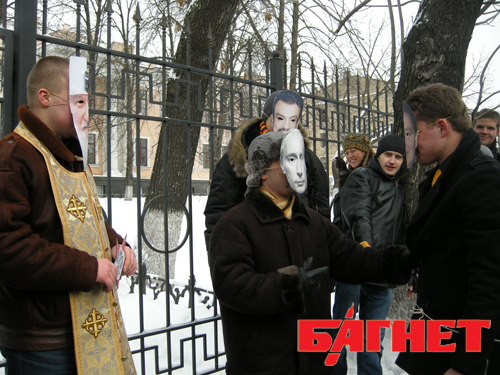 «Для чего мы сегодня это делали? Потому что сегодня День Родного языка, а вот это учреждение, которое называется Министерство науки и образования, молодежи и спорта, под руководством Табачника, это, по сути, штаб русификации Украины на сегодняшний день. И сегодня мы решили показать им представление, где показаны одни из самых одиозных деятелей-украинофобов», - рассказал глава Киевской городской организации ВО «Свобода» Андрей Ильенко.