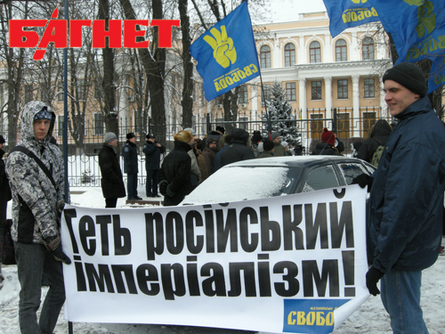 21 февраля Киевская городская организация ВО «Свобода» провела под стенами Министерства науки и образования, молодежи и спорта театрализованное действо под названием «Малоросские холуи на ковре у кремлевских карликов». Мероприятие было приурочено ко Дню Родного языка.
