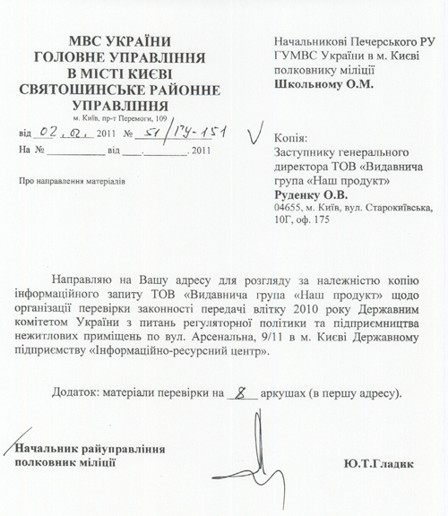 Сегодня стало известно, что все эти махинации Бродского и Коваль проверяют правоохранители. В распоряжении редакции оказался документ – ответ начальника Святошинского районного управления милиции в г.Киеве на информационный запрос по поводу законности передачи летом 2010-го Госкомпредпринимательства нежилых помещений ГП «ИРЦ» (см. фото документа ниже).
