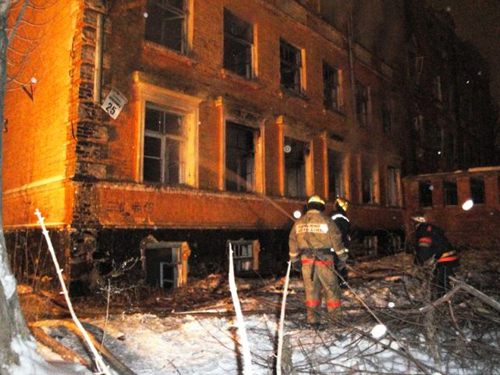 Внутри сооружения были кучи мусора, которые усилили горение и вызвали сильный пожар. Работу спасателей осложнял тот факт, что под действием огня начали разрушаться деревянные перекрытия здания между третьим и четвертым этажами - частично произошло обрушение конструкций.