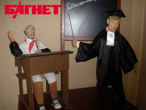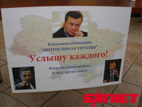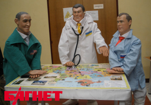 Сегодня, в канун года со дня инаугурации Президента Украины Виктора Янковича, в Одессе открылась кукольная композиция под названием «Интенсивная терапия», состоящая из трех персонажей. Это – пополнение в коллекции «АrТ ЭЛЬ Кукольная Одесса» известного в городе художника, тележурналиста и литератора Михаила Коломея. В центре композиции – Президент Украины Виктор Федорович, по бокам – главы США и России – Барак Обама и Дмитрий Медведев. Три Президента облачены в медицинскую экипировку: Янукович во всем белом, остальные – в цветном, на ногах каждого, как и положено врачам во время операции, - бахилы. При этом все - при галстуках и нагрудных значках в виде флага державы, которой они руководят.