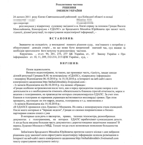 «Опровержение! Извещаю общественность, что информация, распространенная мной, Бродским Михаилом Юрьевичем 06.10.2010 г. и 14.10.2010 г. в Интернете на веб-сайте своего собственного электронного дневника о народном депутате Грицаке Василии Николаевиче и консорциуме «ЕДАПС» является недостоверной.