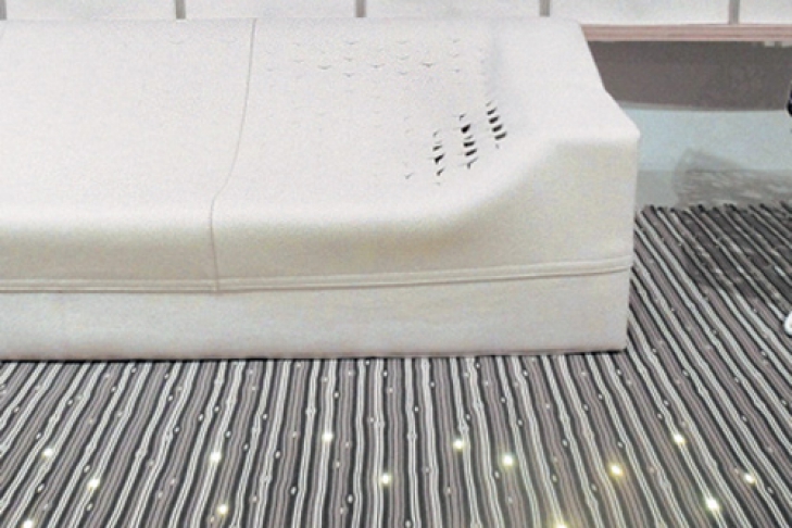 Дизайнеры использовали новый синтетический материал на основе войлока, который под определенным давлением нарезается на полоски разной длины и ширины. Они получаются неровными, и их можно вставлять друг в друга, образуя своего рода клеточную структуру. Комбинируют их в произвольном порядке, таким образом, рисунок не повторяется и каждый раз получается уникальным. Более того, в случае необходимости изделие можно разобрать, заменив поврежденные полоски новыми. Хотя вероятность испортить их крайне мала - новый материал негорючий, обладает водоотталкивающими свойствами. Лампочки LED интегрированы в каждую из полосок, и ковер можно использовать как ночник. Технология создавалась для напольных покрытий самолетов Airbus A350.