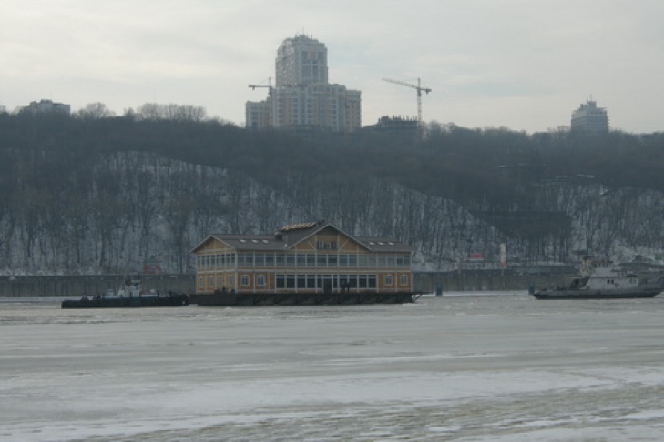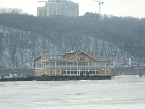 Еще один плавучий объект был отбуксирован с киевской Набережной. 5 марта вверх по течению Днепра двумя буксирами был увезен дебаркадер.