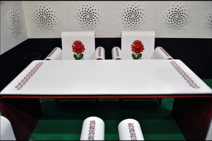 В основу мебельной коллекции легла триада красного, белого и черного оттенков – палитра исконно украинского, национального искусства вышивки. Неслучайно именно эти цвета были взяты дизайнером, ведь они отражают национальную философию украинского народа, символизируют отношение к жизни как таковой, в которой неразрывно связаны такие понятия как радость и печаль, любовь и разлука. Вышивка на камне - по-настоящему неожиданное решение для дизайна, ставшее возможным благодаря инновационным технологиям обработки материала.