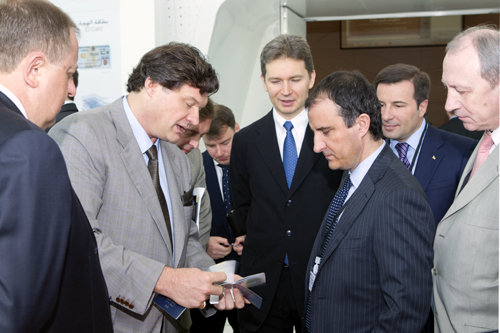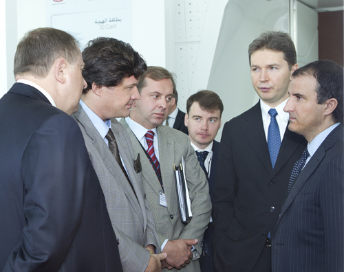 Переговоры на стенде консорциума «ЕДАПС» (слева направо): Василий Грицак, Юрий Сидоренко, посол Украины в ОАЭ Юрий Полурез, первый секретарь посольства Украины в ОАЭ Владимир Комашко, председатель Совета директоров «ЕДАПС» Александр Васильев, еврокомиссар Луиджи Сорека