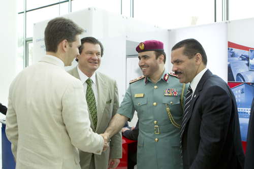 Заместитель министра внутренних дел ОАЭ Ахмед Н. Аль Рази (в центре, в форме) на стенде консорциума «ЕДАПС». Также на фото (слева направо): председатель совета директоров «ЕДАПС» Александр Васильев, председатель Консультативного совета консорциума «ЕДАПС» Юрий Сидоренко, генеральный секретарь INTERPOL Рональд Ноубл (первый справа)