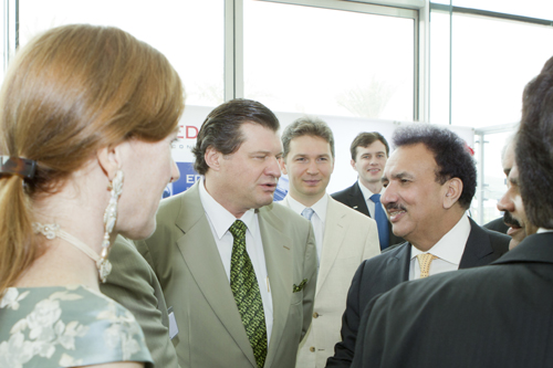 Министр внутренних дел Пакистана Рехман Малик (справа) и председатель Консультативного совета консорциума «ЕДАПС» Юрий Сидоренко (слева) возле стенда консорциума