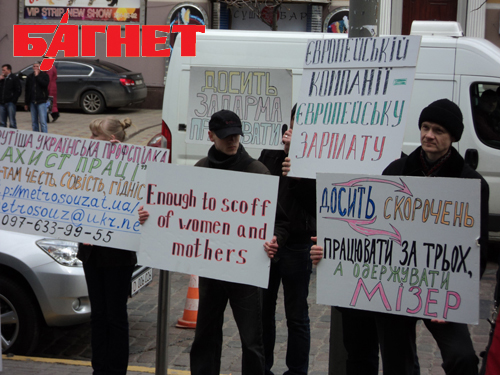 Сегодня, 13 апреля, под стенами посольства Германии прошел митинг сотрудников сети гипермаркетов «METRO Cash & Carry». По словам участников акции, они были вынуждены обратиться к немецкой стороне с нотой протеста по поводу противоправных, по их мнению, действий руководства торговой сети. В частности, активисты требуют вернуть начисления бонусов по итогам года, прекратить практику скрытого сокращения работников, сократить лишний административный аппарат, установить компенсацию на обед в размере 25 гривен, прекратить практику запрета сотрудникам «METRO Cash & Carry» получать товары со скидкой, честно в соответствии с законом индексировать зарплату и др. По словам одного из организаторов пикета, председателя ЦК профсоюза «Захист праці» Олега Верника, руководство METRO в Украине ведет дискриминационную политику по отношению к своим сотрудникам.