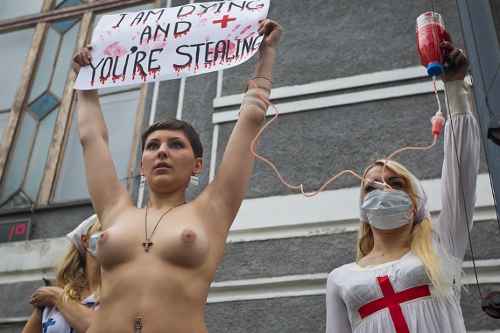 Активистка женского движения FEMEN Алина Ковальчук, у которой рак лимфоузлов второй стадии, предъявила претензии Министерству охраны здоровья Украины. Девушка протестовала топлес , развернув плакаты с надписями «Я умираю, а вы крадете!», «Эпидемия рака совести», «Momento mori, Yemets!» и так далее.