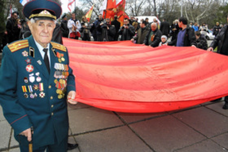 По словам Панькевича, автобусы с провокаторами с георгиевскими лентами находились за городом на Окружной. Когда же оппонентов Дня Победы у мемориального комплекса стало меньше, автобусы прибыли на Холм Славы и, вопреки судебному запрету, под охраной милиции пронесли красное знамя на Холм Славы.