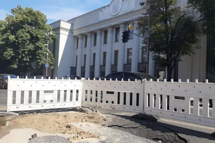 В среду, 29 июля, в Киеве, на улице Грушевского, прямо возле здания Верховной Рады, провалился асфальт. Дорожное покрытие разрушилось вследствие прорыва трубопровода под проезжей частью. Как передает BAGNET, об этом сообщили КП ДЭУ Печерского района.