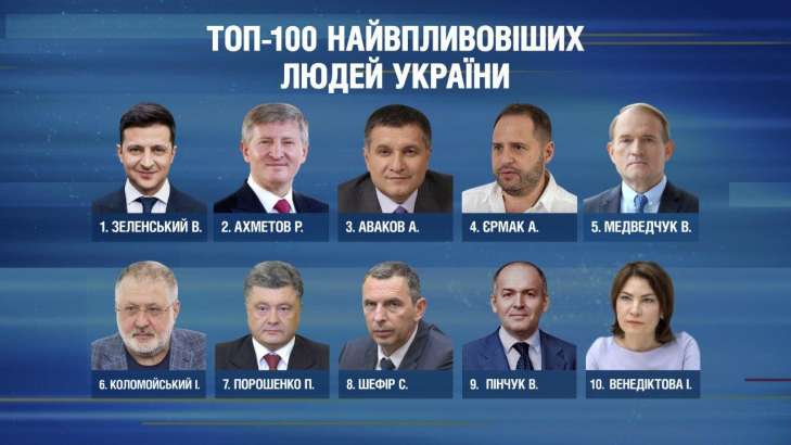 В первую десятку рейтинга вошли ряд политиков и бизнесменов, а именно: Владимир Зеленский, президент Украины, Ринат Ахметов, владелец группы компаний СКМ, Арсен Аваков, глава МВД, Андрей Ермак, глава Офиса президента, Виктор Медведчук, председатель политсовета партии "Оппозиционная платформа - За жизнь", Игорь Коломойский, совладелец финансово-промышленной группы "Приват", Виктор Пинчук, бизнесмен, основатель EastOne Group, Ирина Венедиктова, генеральный прокурор.