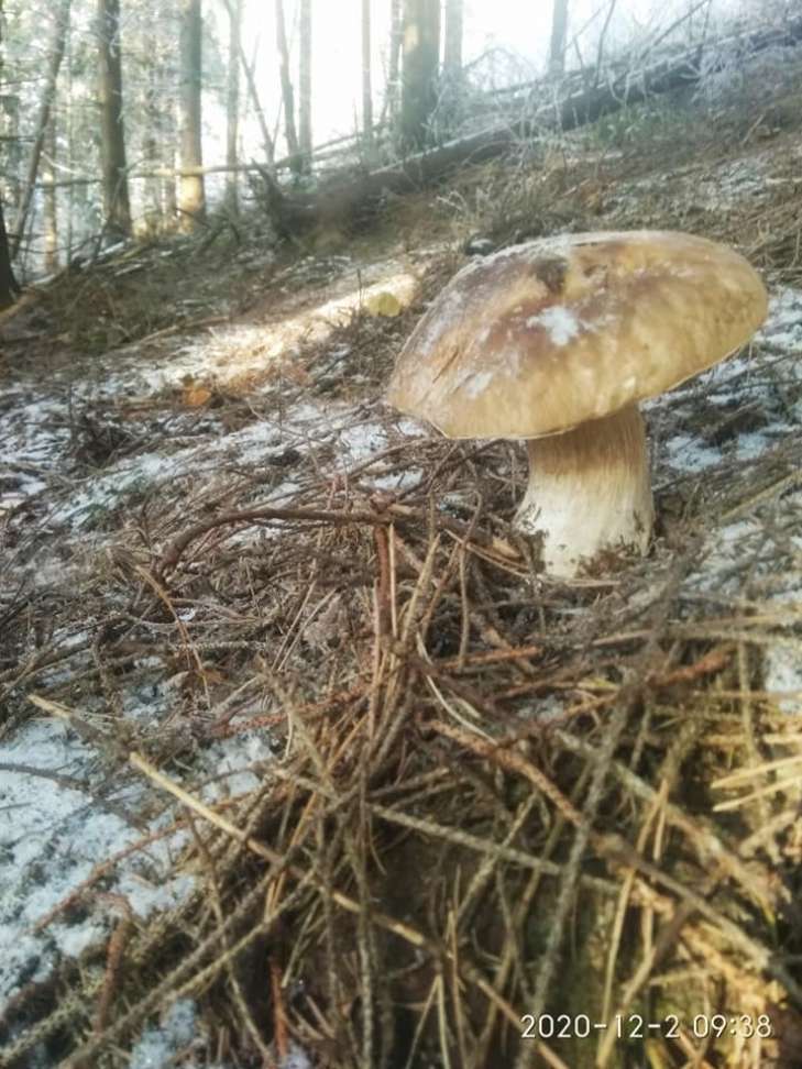 В лесу возле поселка Солотвино он нашел абсолютно здоровые белые грибы. Как свидетельствуют опубликованные снимки, удачный поход за грибами состоялся 2 декабря, когда в горах уже лежал снег и начались морозы.