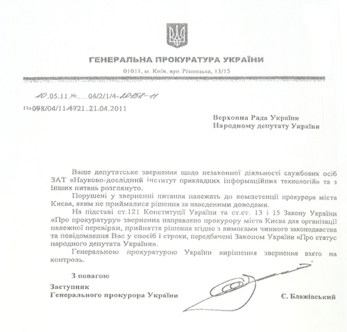 Такое положение вещей не могло оставить безразличными народных депутатов, заинтересовавшихся этим вопросом. Причина очевидна – необходимость пресечь явно незаконную деятельность сотрудников ЗАО «НИИ ПИТ». Заместитель генпрокурора страны Евгений Блаживский ответил нардепу, что затронутые им вопросы относятся к компетенции прокуратуры столичной. Таким образом, депутатское обращение относительно деятельности попадет в прокуратуру Киева, которая проведет соответствующие проверки и примет решение согласно действующему законодательству. (см. фото документа ниже).