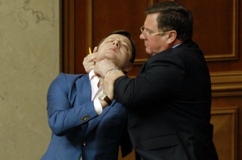 На последней строчке нашего рейтинга разместилась самая свежая стычка двух парламентариев, которая стала полной неожиданностью. 18 мая, во время рассмотрения одного из законопроектов, народный депутат Олег Ляшко зашел в президиум и попытался что-то доказать первому вице-спикеру Адаму Мартынюку. Однако тот, видимо, исчерпав словесные аргументы, попытался вытеснить Ляшко из президиума и схватил его за шею.