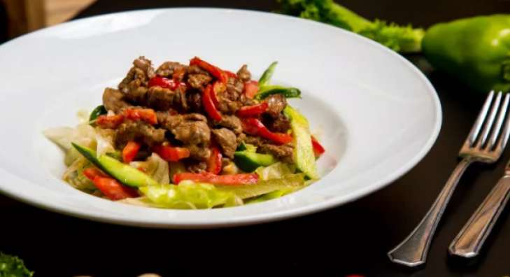 На тарелку выложите промытые и обсушенные листья салата, а сверху – порцию овощей с мясом.