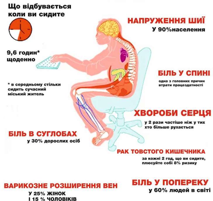 Вчені радять займатися спортом по 20 хвилин три рази на тиждень і регулярно вставати і рухатися на сидячій роботі.