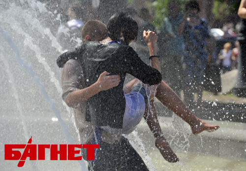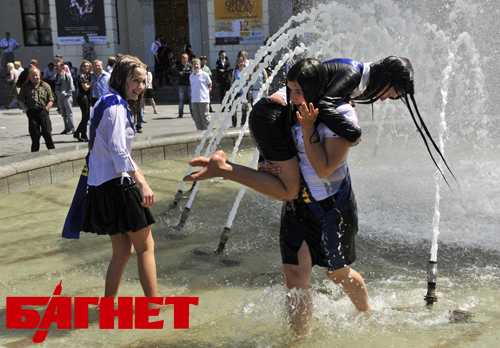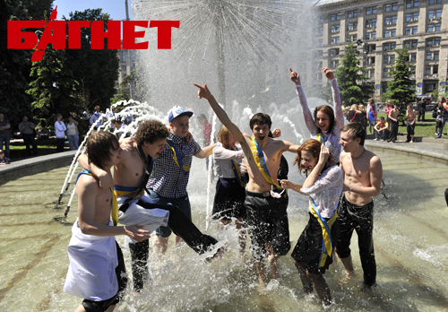 В центре Киева не прекращаются гуляния выпускников. Молодежь плюнула на дорогие наряды и содержимое карманов: в фонтанах на Майдане некоторые умудряются даже поплавать. Мальчишки поснимали рубашки и галстуки, девчонки окончательно наплевали на прически и макияж. Бурное веселье в фонтанах периодически нарушают спецподразделения. Правоохранители прохаживаются вдоль фонтанов, жестами приказывая выходить. Отметим, корреспонденту «Багнета» не удалось увидеть выпускников с алкогольными напитками. Весь «рацион» - мороженое, квас, кола и сигареты «внычку». Правда, ближе к вечеру молодые люди все чаще подходят к киоскам с пивом, мечтательно глядя на витрины. Что ж, праздник продолжается.