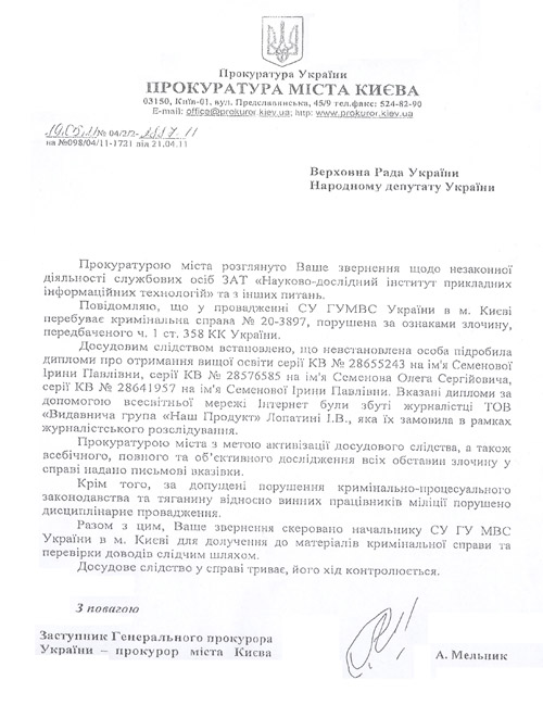 Мы уже сообщали, что «НИИ ПИТ» нагло пользуется положением монополиста – украинские ВУЗы вынуждены закупать продукцию этого частного предприятия по драконовским завышенным ценам. Разумеется, такое положение дел не могло оставить безразличными ни общественность, ни народных депутатов, ни правоохранительные органы. По данным, полученным журналистами, возбуждено уголовное дело по ч. 1 ст. 358 Криминального кодекса Украины (Подделка документов, печатей, штампов и бланков, их сбыт, использование поддельных документов). Об этом сообщил заместитель генерального прокурора – прокурор г. Киева (см. фото документа).