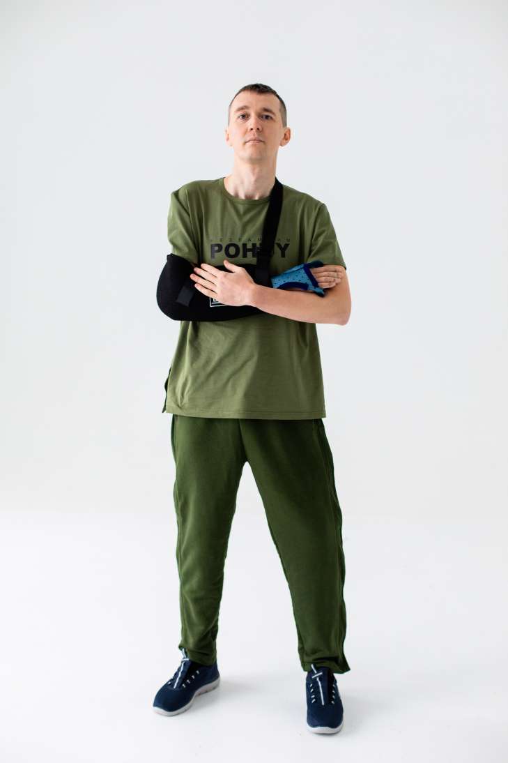 Він пояснив, що вдягати звичні штани через ногу, розірвану уламками, нестерпно боляче. Як і натягувати футболку через руку, зібрану хірургами зі шматків м‘яса та кісток.