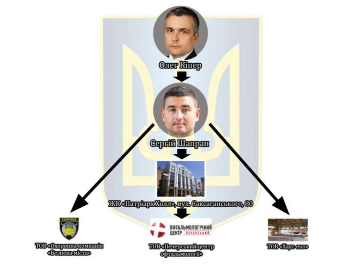 Відтак, ТОВ «ХАУС – ЕКО» - виробничий комплекс по будівництву та зборці дерев’яних будинків, який належав моєму чоловіку, переоформлено на ТОВ «ОХОРОННА КОМПАНІЯ «БЕЗПЕКА МІСТА», де кінцевим бенефіціаром є той самий Шапран С. В., бізнес-партнер Кіпера О. Приміщення за адресою вул. Коперника, 12-Д наразі перебувають у володінні орендаря – ТОВ «Печерський центр офтальмології», який сплачує орендну плату структурам Шапрана С. В., натомість 1/3 частина вказаних приміщень, на яку в порядку спадкування маю законне право, була арештована за ініціативою прокуратури Подільського району, щоб не допустити отримання мною спадщини.