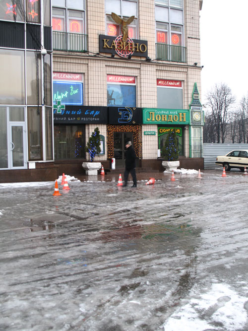 Представьте , как интуристы, заплатившие 350 евро и более за номер класса «люкс» в отеле «Днипро», в начищенных до блеска ботинках перепрыгивали лужи со снежной кашей, чтобы добраться до ожидающей их машины или такси.